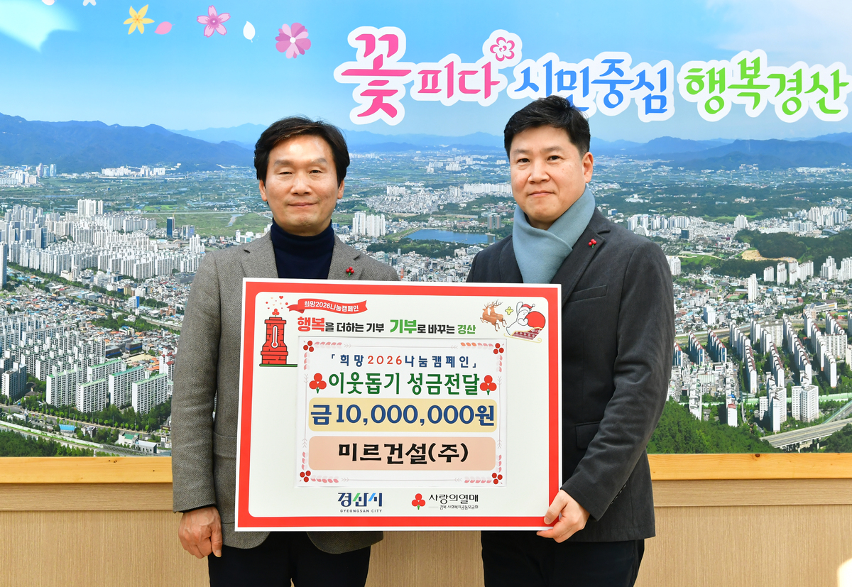 미르건설(주)(대표 이승훈)이 경산시에 지역 내 어려운 이웃을 돕고자 성금 1000만 원을 기탁 했다.