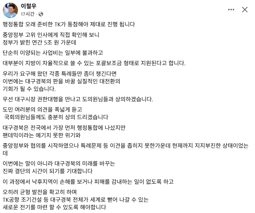 이 도지사는 17일 밤 페이스북에 올린 글에서 “중앙정부 고위 인사에게 직접 확인해보니 정부가 밝힌 (통합특별시에 4년간 매년 ) 연간 5조원 가운데 단순 이양되는 사업비는 일부에 불과하고 대부분 지방이 자율적으로 쓸 수 있는 포괄보조금 형태로 지원된다고 했다“면서 “우리가 요구해 왔던 각종 특례들만 좀 더 챙긴다면 이번에는 대구경북의 판을 바꿀 실질적인 대전환의 기회가 될 수 있다”고 말했다.