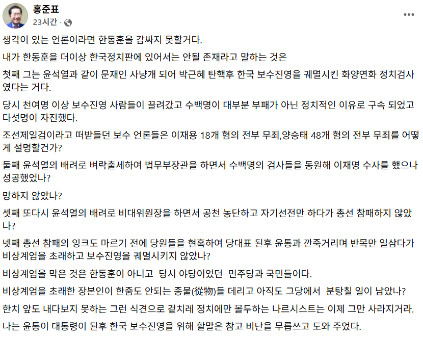 홍 전 시장은 이날 이보다 앞서 올린 페이스북에서도 “두 번 탄핵의 주범을 추종하는 종물(從物)들"이라는 표현을 하면서 한 전 대표와 친한계 의원들까지 ‘정치쓰레기’라고 깎아내렸다.