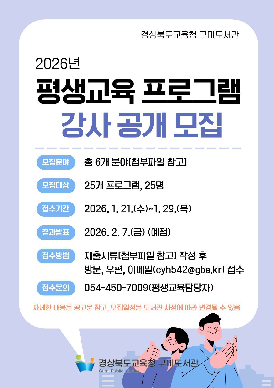 경북도교육청 구미도서관은 21일부터 29일까지 2026년 평생교육 프로그램을 운영할 우수한 강사를 공개 모집한다.