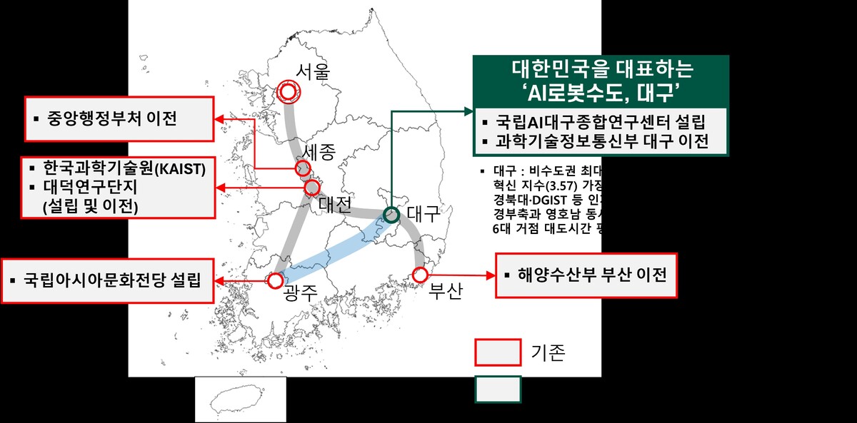 특히 AI 로봇 수도 국가전략 실현을 위해 △광주 문화수도 모델을 적용한 ‘국립대구AI종합연구센터 설립’ △부산 해양수도 모델을 반영한 ‘과학기술정보통신부 대구 이전’을 결합한 알파(α)·베타(β) 전략이 필요하다고 강조했다. 핵심 국가 앵커기관의 설립과 이전을 동시에 추진해야 국가 차원의 산업 수도 전략이 완성된다는 설명이다.