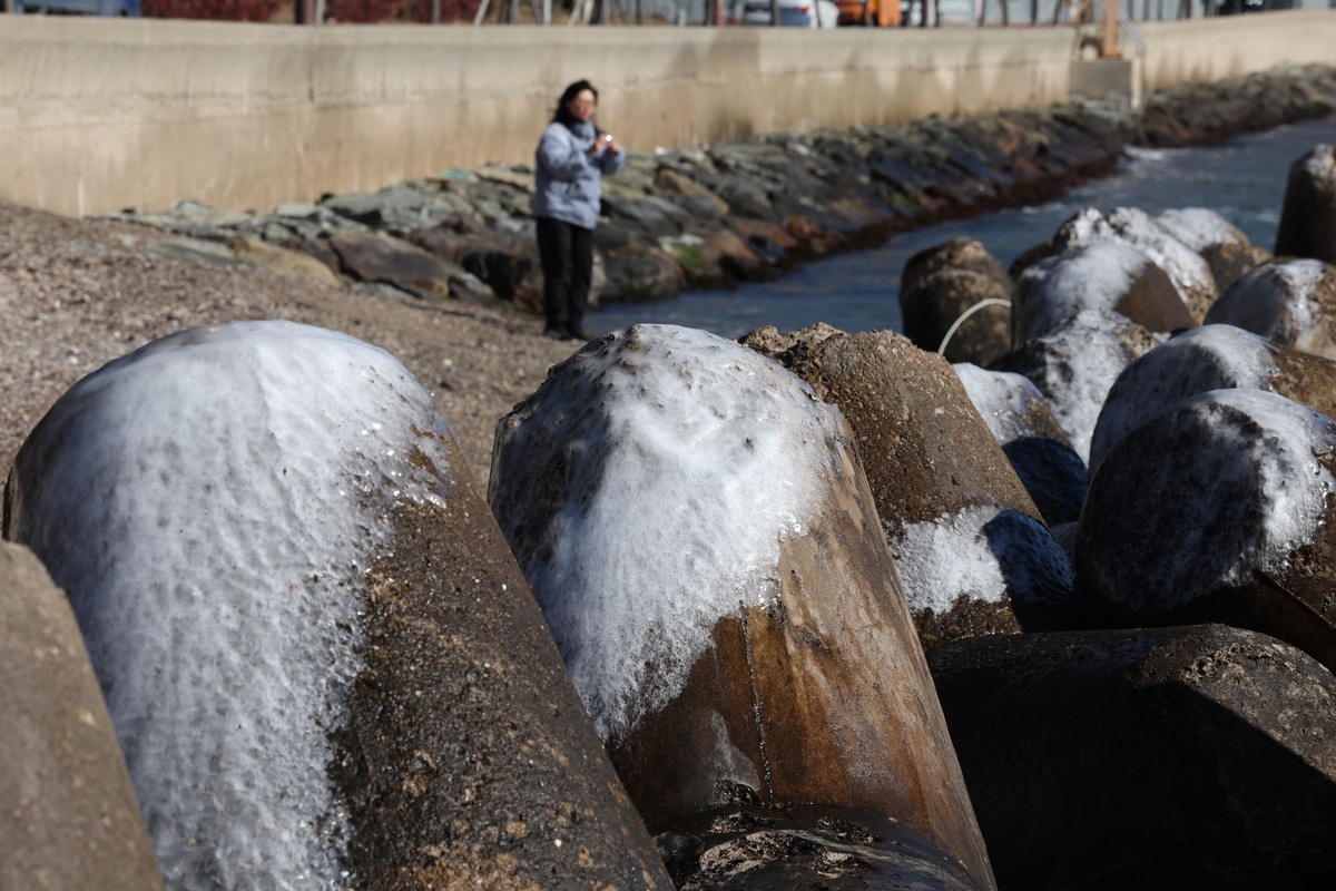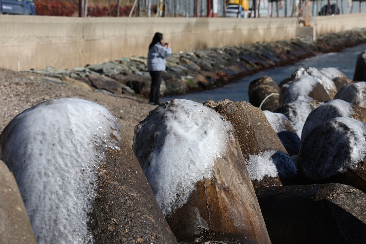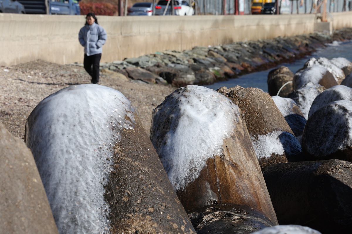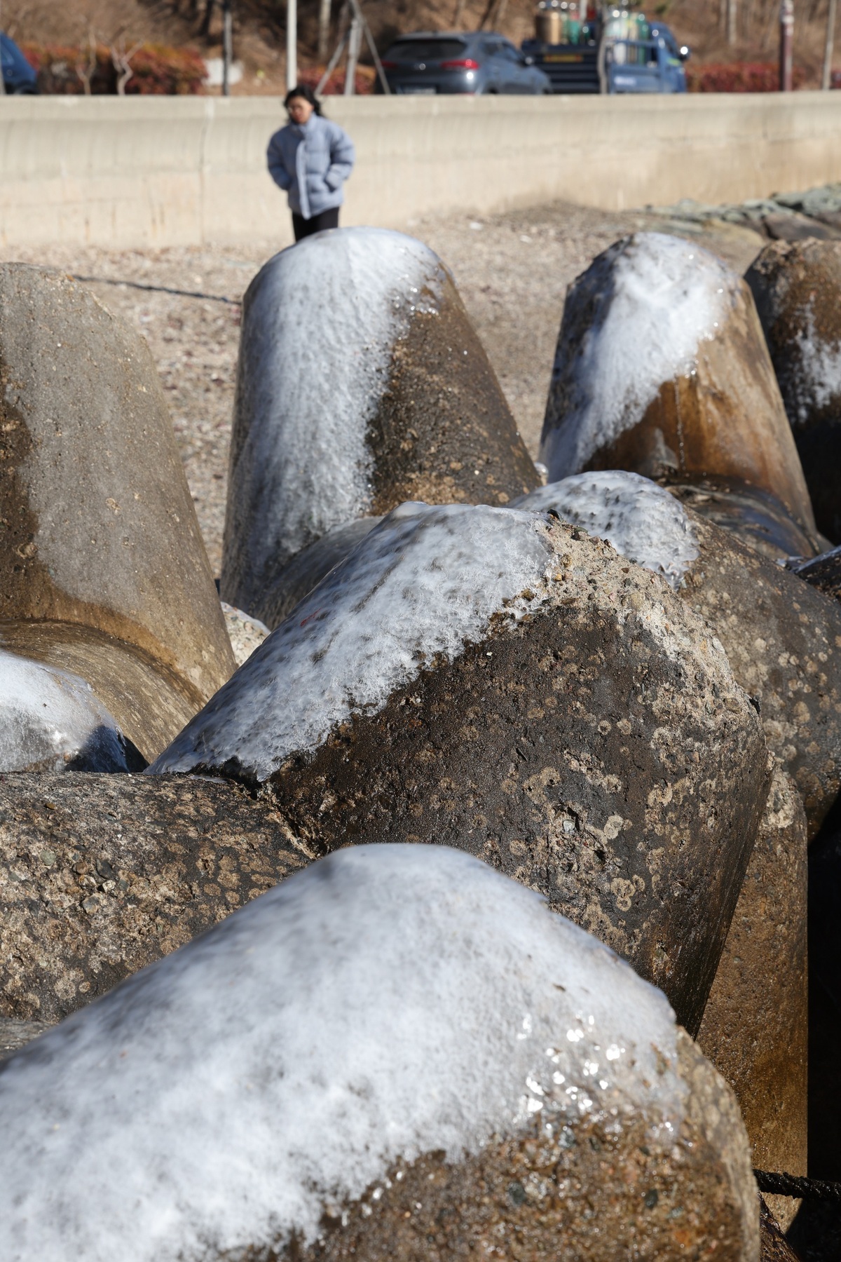 대구·경북 지역의 체감기온이 온종일 영하권에 머문 21일 오후 포항시 북구 환여동 해변 테트라포드에 바닷물이 얼어붙어 있다. /이용선기자 photokid@kbmaeil.com