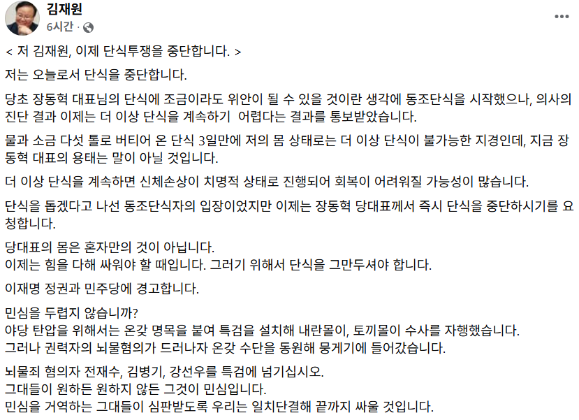 그는 “물과 소금만으로 단식 3일째에 더 이상 단식이 불가능한데, 장 대표의 몸 상태는 말이 아닐 것”이라며 “장 대표는 즉시 단식을 중단하기를 요청한다”고 적었다.