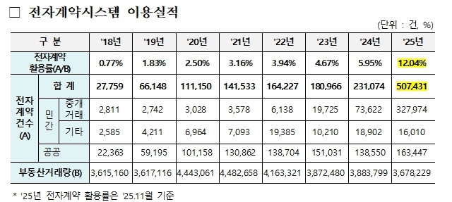 2025년 연간 50만건 돌파, 민간 중개 부문 4.5배 성장⋯활용률 첫 12%대