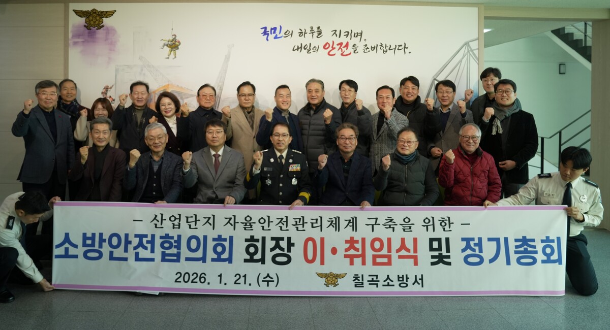 칠곡소방서는 최근, 소방서 2층 회의실에서 소방안전협의회 회장 이‧취임식과 정기총회를 개최했다. 이번 행사에는 칠곡소방서장 및 소방공무원, 소방안전협의회 회원 등 40여 명이 참석해 자리를 빛냈다.