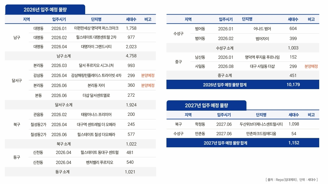 그러나 2026년부터는 시장 환경이 크게 달라질 전망이다. 2022년부터 2024년까지 7만 7700여 세대가 입주한 이후 공급이 급감하면서, 2026년 예정 입주 물량은 1만 179세대로 줄어든다. 상반기 남구 명덕역 이편한세상, 대명힐스테이트2차, 대명자이 등 3개 단지 4758세대 입주가 마무리되면 하반기에는 신축 입주 단지가 사실상 자취를 감출 것으로 보인다. 입주 물량은 2027년 1152세대, 2028년 1498세대로 더 줄어드는 구조다.
