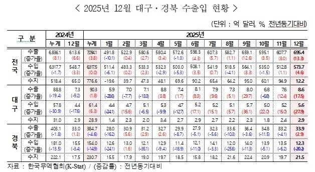 한국무역협회 대구경북지역본부가 22일 발표한 ‘2025년 12월 대구·경북 수출입 동향 보고서’에 따르면, 지난해 12월 대구 수출은 8억 6000만 달러로 전년 동기 대비 17.5% 증가했다. 경북 수출도 33억 9000만 달러로 2.9% 늘며 플러스 성장으로 전환됐다.