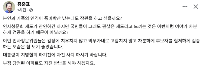 홍 전 시장은 24일 오후 페이스북에 이혜훈 기획예산처 장관 후보자에 대해 “본인과 가족의 인격이 풍비박산이 났는데도 장관을 하고 싶을까요”라고 적으면서 "인사청문위원들을 칭찬했다.