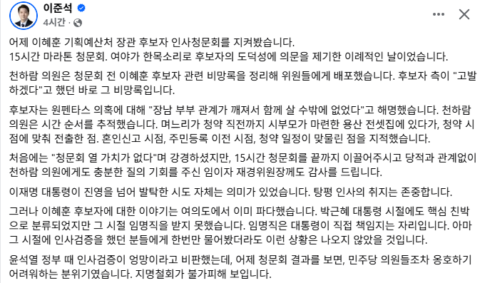 그러면서 “윤석열 정부 때 인사검증이 엉망이라고 비판했는데, 어제 청문회 결과를 보면 민주당 의원들조차 옹호하기 어려워하는 분위기였다. 지명철회가 불가피해 보인다”고 썼다.