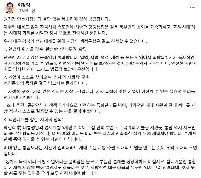 이 시장은 23일 페이스북에 권기창 안동시장의 ‘대구경북 행정통합, 균형발전 권한 이양돼야’라는 언론 인터뷰를 공유하면서 “지금처럼 속도전에 치중한 행정통합은 경북 북부권의 소외를 가속화하고 지방시대라는 시대적 과제를 허망한 정치구호로 전락시킬 뿐”이라고 했다.