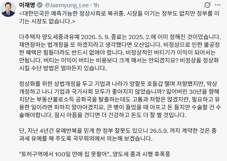 이 대통령은 이날 다시 엑스(X·옛 트위터)에 글을 올려 “다주택자 양도세 중과 유예가 5월 9일에 종료되는 것은 지난해 이미 정해진 일“이라며 제도를 유예하지 않고 폐지하겠다는 뜻을 다시 밝혔다.