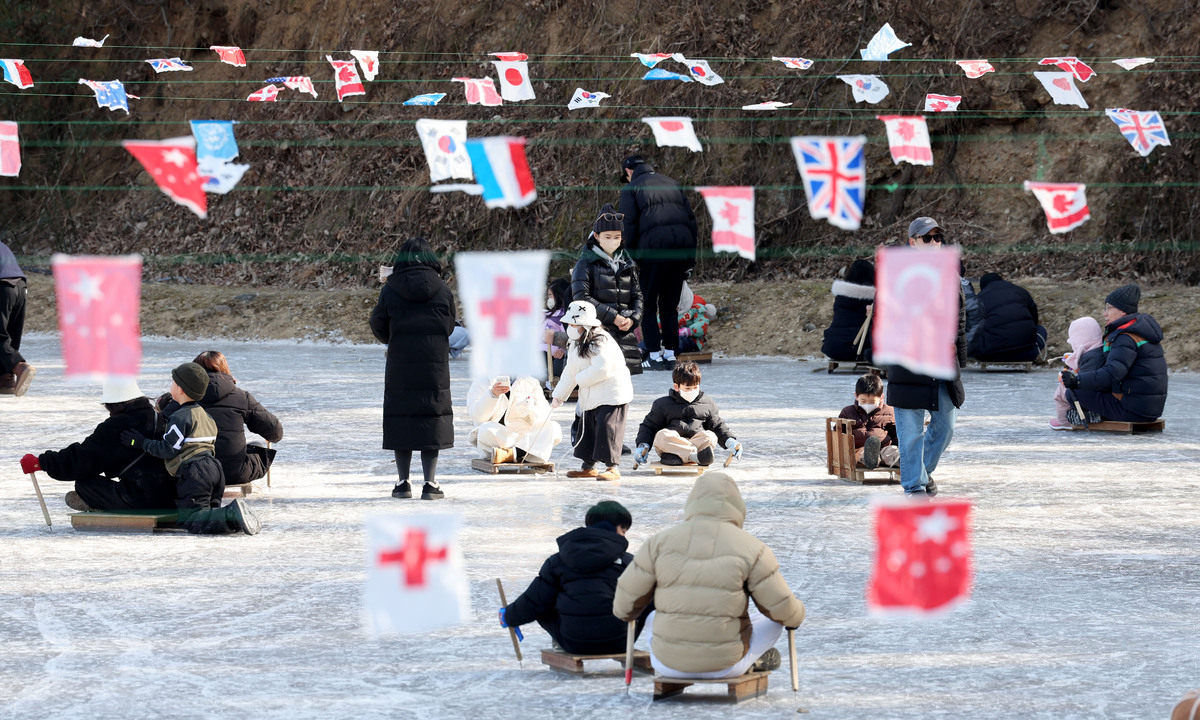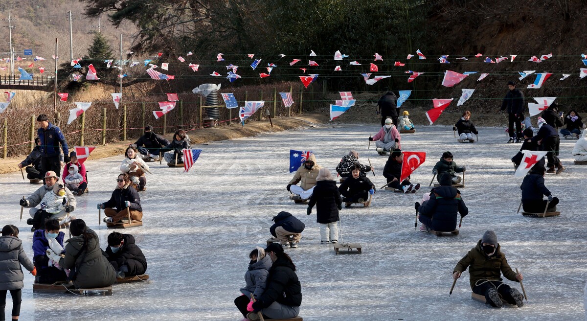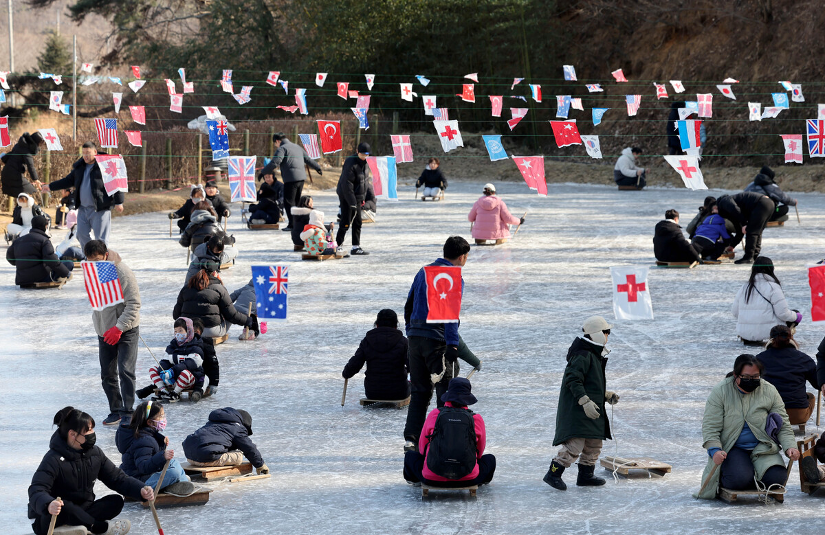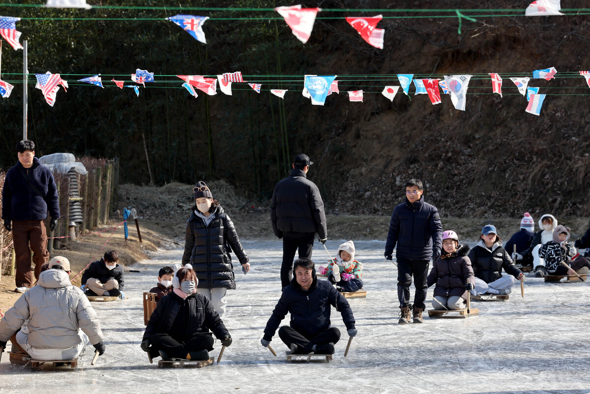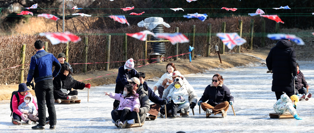 포항 지역 낮 최고 기온이 4.4℃를 기록하며 동장군의 기세가 한풀 꺾인 25일 오후 이명박 전 대통령 고향마을인 북구 흥해읍 덕실마을의 썰매장을 찾은 가족 단위의 시민들이 흥겨운 한때를 보내고 있다. /이용선기자 photokid@kbmaeil.com