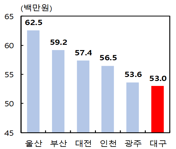 한국은행 대구경북본부가 26일 발표한 연구보고서에 따르면 2024년 기준 대구지역 서비스업 노동생산성은 1인당 5300만원으로, 울산(6250만원)의 85% 수준에 그쳤다. 부산·인천·대전·광주 등 다른 광역시 평균보다도 낮아 광역시 가운데 최저치를 기록했다. 최근 10년간(2015~2024년) 대구 서비스업 노동생산성 증가율은 연평균 1.5%로 전국(1.6%)과 여타 광역시 평균(1.7%)을 모두 하회했다.