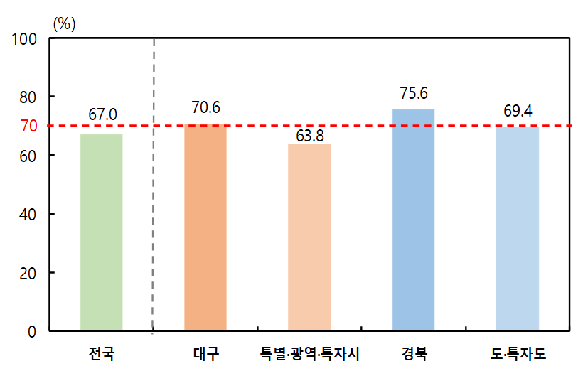 공적연금과 기초연금 수급률은 전국보다 높지만, 빈곤선 이상의 소득 확보에는 한계가 있다는 지적도 나왔다. 대구·경북 노인의 기초연금 수급률은 각각 70.6%, 75.6%로 전국 평균을 웃돌았으나, 1인 노인가구가 국민연금과 기초연금을 모두 수령해도 상대적 빈곤선(월 128만원)을 넘기기 어려운 구조다. 보고서는 근로소득 등 추가적인 소득원이 필수적이라고 분석했다.