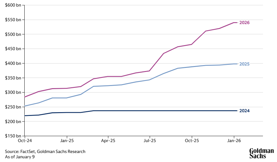 골드만삭스에 따르면 AI는 이미 금융시장의 핵심 변수로 자리 잡았다. 월가 애널리스트들은 주요 하이퍼스케일 클라우드 기업들이 2026년에만 5천억 달러 이상을 AI 설비투자에 투입할 것으로 보고 있다. 현재 미국 증시에서 상위 7개 기술기업은 S&P500 시가총액의 30% 이상과 이익의 약 25%를 차지한다.