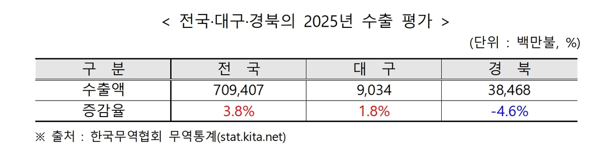 지난해 전국 수출이 전년 대비 3.8% 증가한 7094억 달러를 기록한 가운데, 대구와 경북의 수출 실적은 뚜렷한 온도차를 보였다.