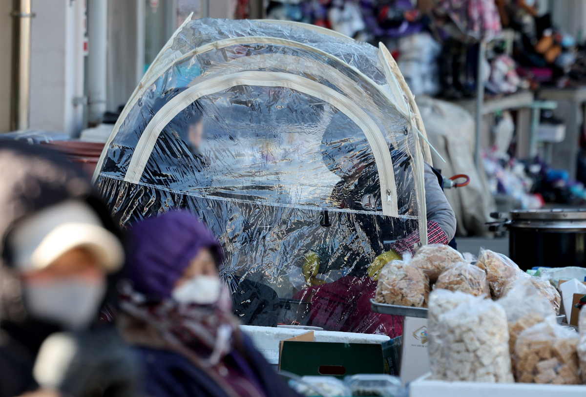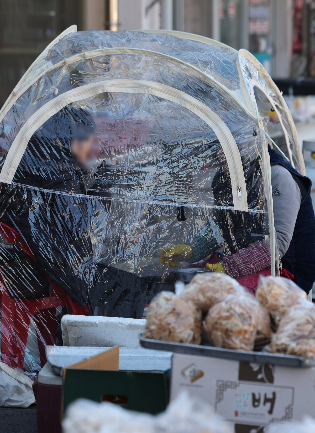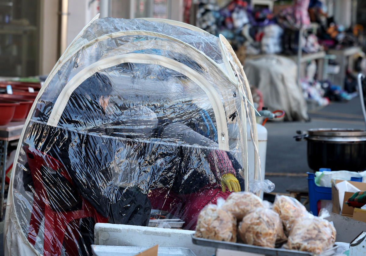 포항 지역 아침 최저 기온이 영하 1.2℃를 기록한 27일 오전 오일장이 열린 북구 흥해읍 전통시장의 상인이 비닐 텐트를 설치해 찬바람을 피하고 있다. /이용선기자 photokid@kbmaeil.com