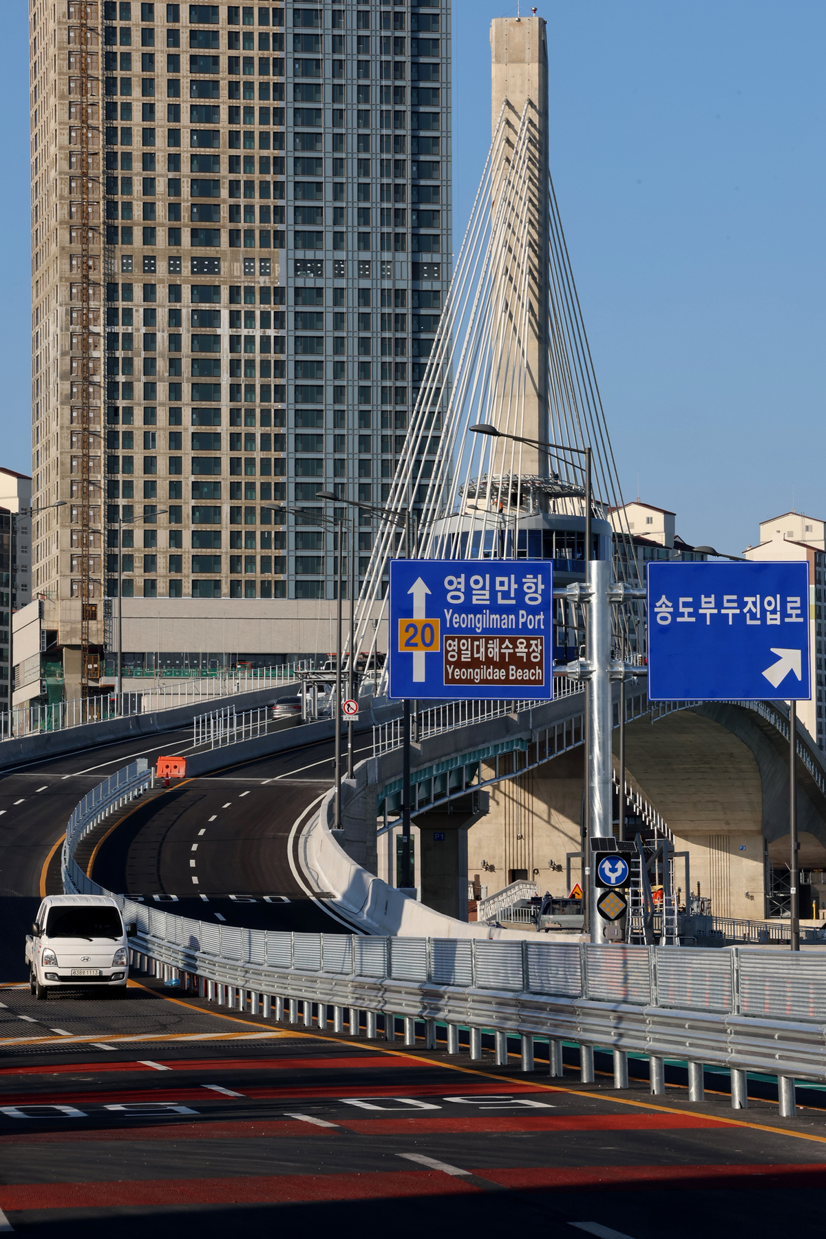 포항 남구 송도동과 북구 항구동을 연결하는 해오름대교의 임시 개통이 추가 안전 점검을 이유로 오는 30일에서 다음 달 2일 오후 2시로 연기된다. 29일에 할 예정이던 개통식도 31일로 미뤘다. 27일 오후 해오름대교 마무리 공사가 한창이다. /이용선기자 photokid@kbmaeil.com