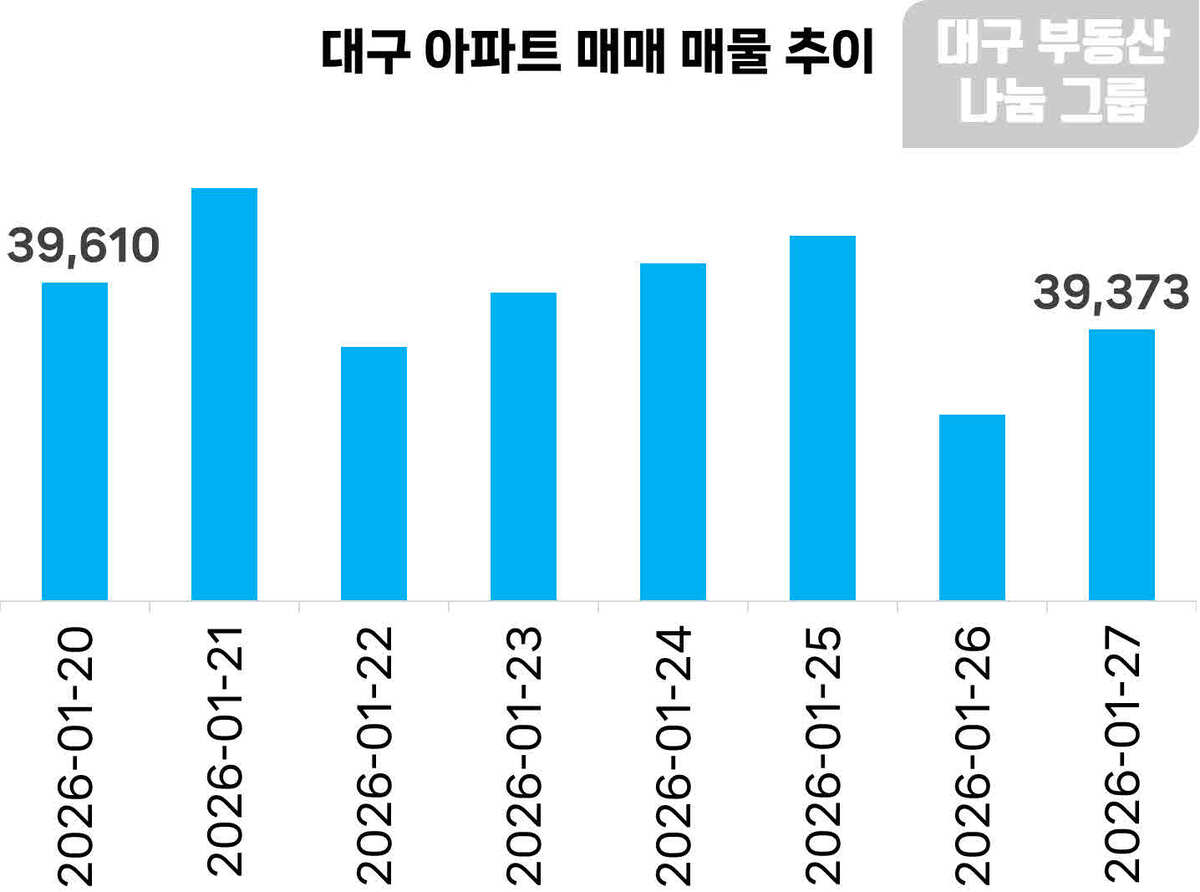 1월 한 달 전체 흐름에서도 같은 경향이 이어졌다. 월 초 이후 대구 아파트 매물 수는 3만 9000건대에서 제한적인 등락만 반복했을 뿐, 다주택자 양도세 유예 종료 방침이라는 강한 정책 신호가 실제 매물 출회로 연결되지는 않았다. 단기적인 심리 변화가 매도 결정으로 이어지지 않았다는 의미다.