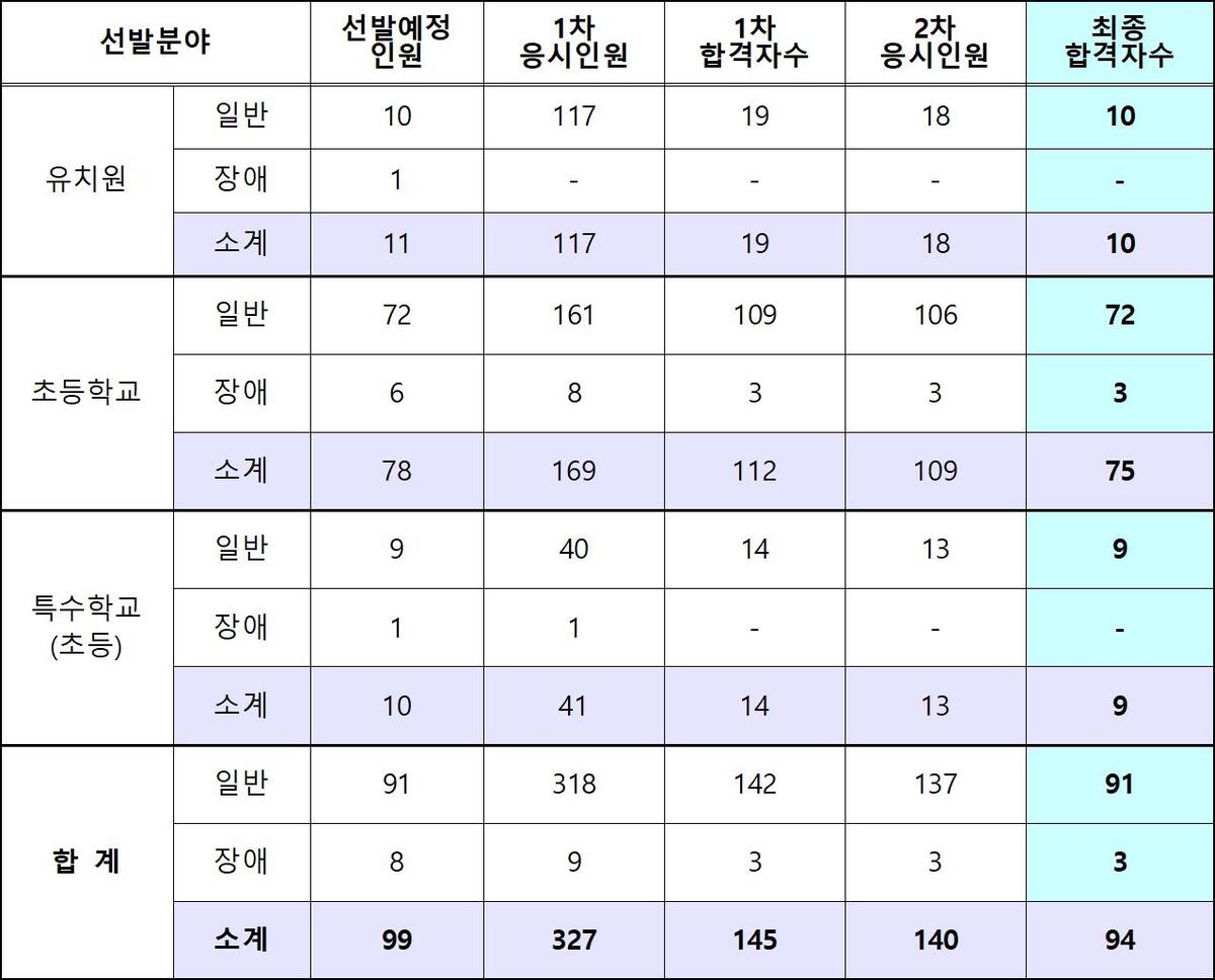올해 최종 합격 인원은 유치원 교사 10명, 초등학교 교사 75명, 특수학교(초등) 교사 9명 등 총 94명이다.
