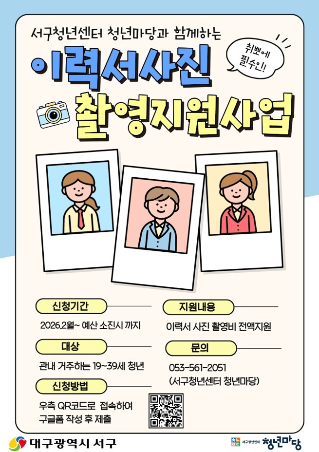 ‘이력서 사진 촬영 지원 사업’은 서구에 거주하는 19~39세 청년을 대상으로 이력서용 사진 촬영과 포토샵 보정, 사진 인화까지 무료로 지원하는 프로그램이다. 오는 28일부터 예산 소진 시까지 선착순으로 참여자를 모집한다.
