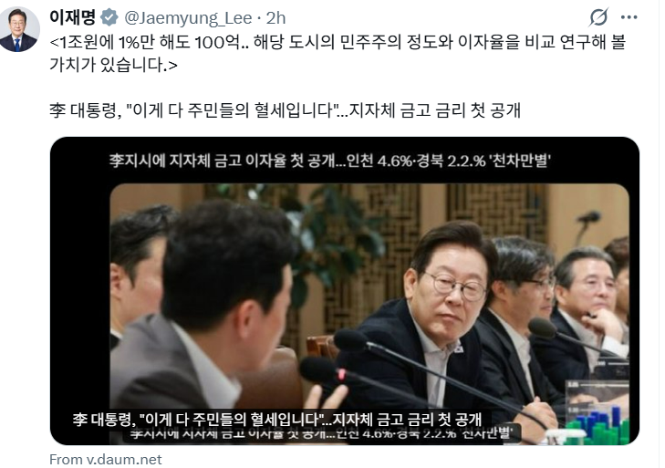 이 대통령은 또 비슷한 시간 엑스에 ‘전국 지방자치단체의 금고 이자율’을 공개한 기사도 소개했다.