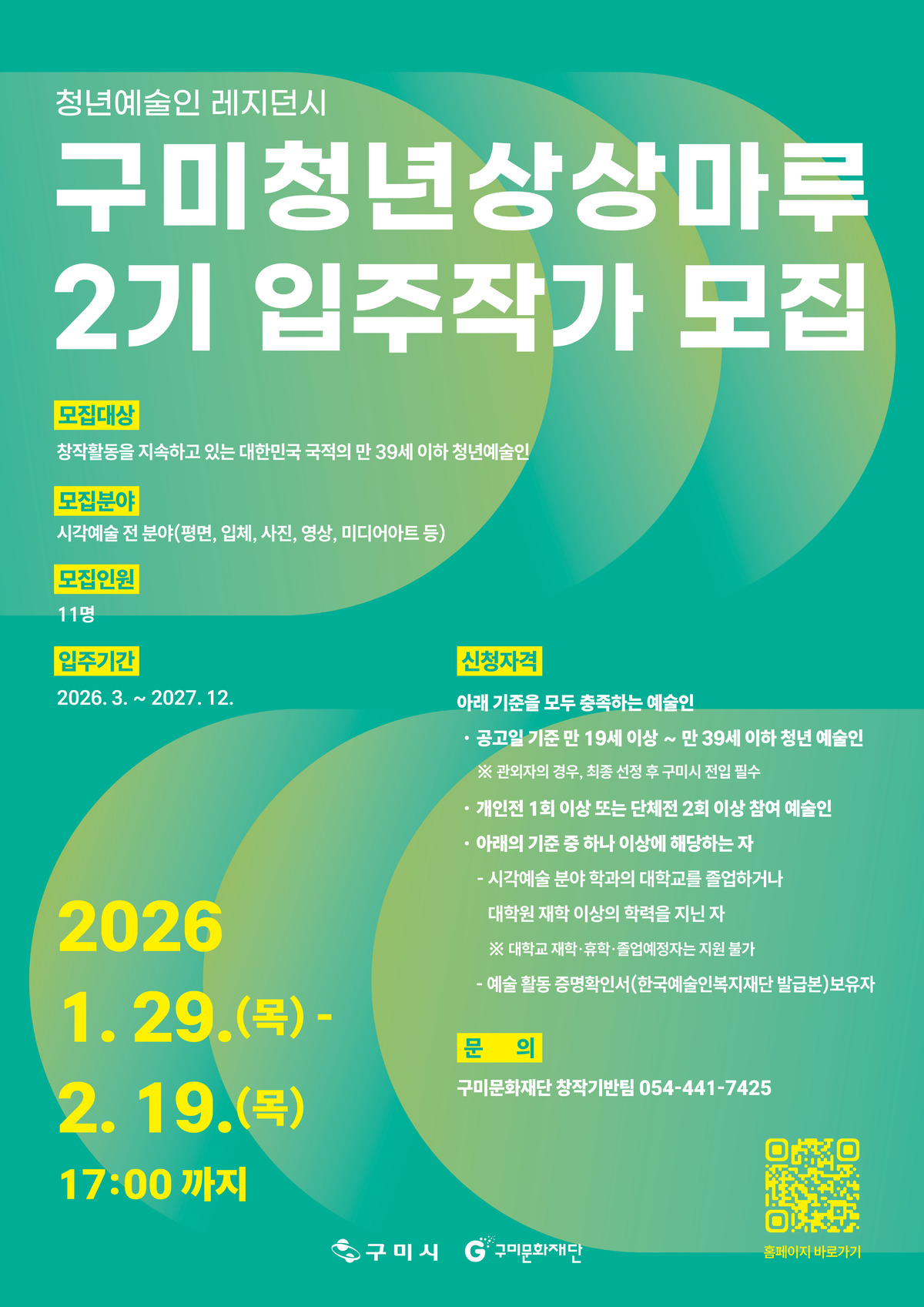 접수 기간은 2월 19일(목)까지이며, 지원을 희망하는 예술인은 관련 서류를 이메일로 제출하면 된다. 모집과 관련한 자세한 사항은 구미문화재단 홈페이지(www.gucf.or.kr)를 통해 확인할 수 있다.