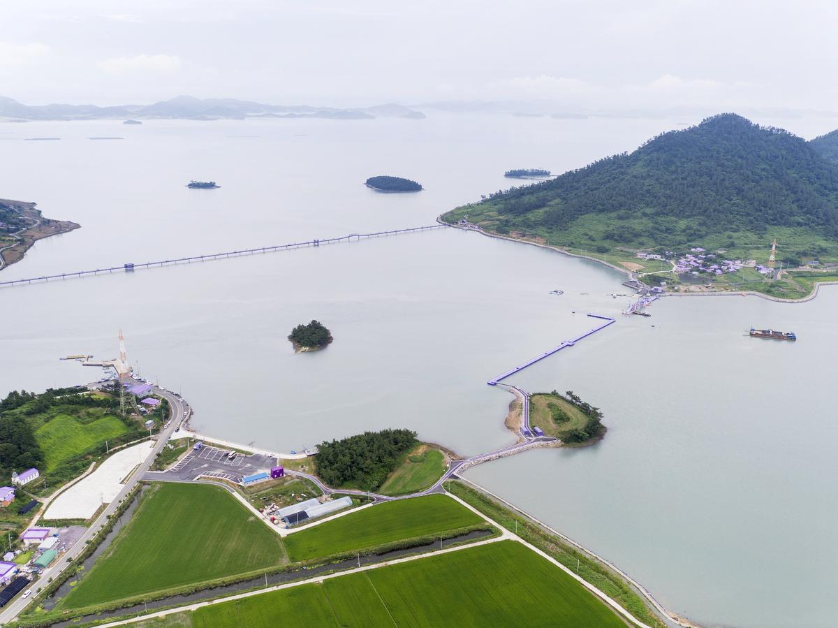 안좌도 남쪽 두리마을에서 박지도로 향하는 길은 보랏빛으로 물든다. 2011년 완공된 길이 547m의 퍼플교 덕분에 이제는 걸어서 섬에 닿을 수 있다. 다리 이름처럼 난간부터 바닥까지 온통 보라색이다.