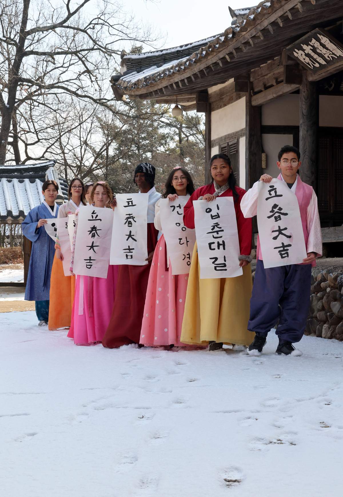봄이 시작된다는 절기 입춘(立春)을 이틀 앞두고 눈이 내린 2일 오전 영남대학교 경산캠퍼스 민속촌 구계서원에서 한국 전통문화 체험에 참여한 외국인 교환학생들이 붓글씨로 직접 쓴 입춘첩을 들고 진덕문으로 향하고 있다. /이용선기자 photokid@kbmaeil.com