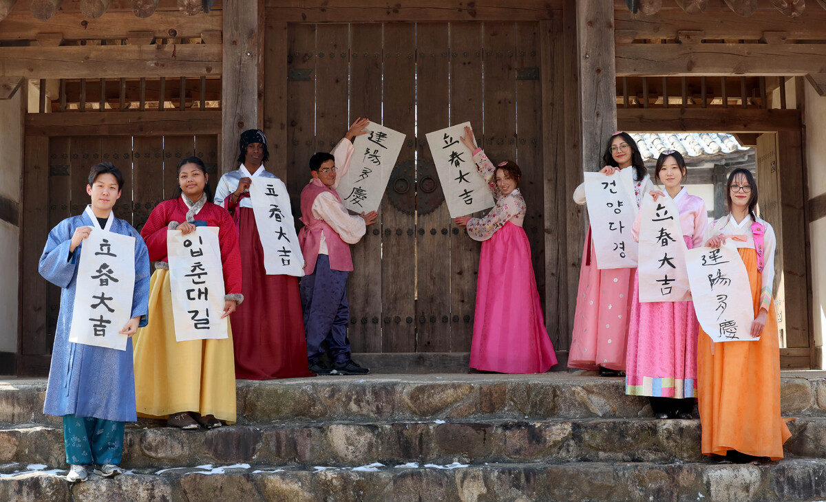 봄이 시작된다는 절기 입춘(立春)을 이틀 앞둔 2일 오전 영남대학교 경산캠퍼스 민속촌 구계서원 진덕문에서 한국 전통문화 체험에 참여한 외국인 교환학생들이 붓글씨로 직접 쓴 입춘첩을 붙이고 있다. /이용선기자 photokid@kbmaeil.com