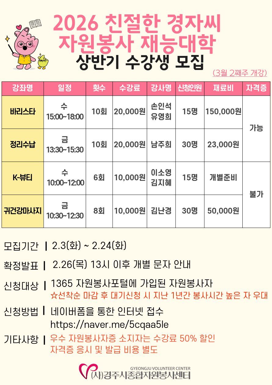 (사)경주시종합자원봉사센터가 지역 내 나눔 문화를 확산하고 자원봉사자의 역량을 강화하기 위해 오는 3월부터 6월까지 ‘2026 친절한경자씨 자원봉사 재능대학’을 운영한다.