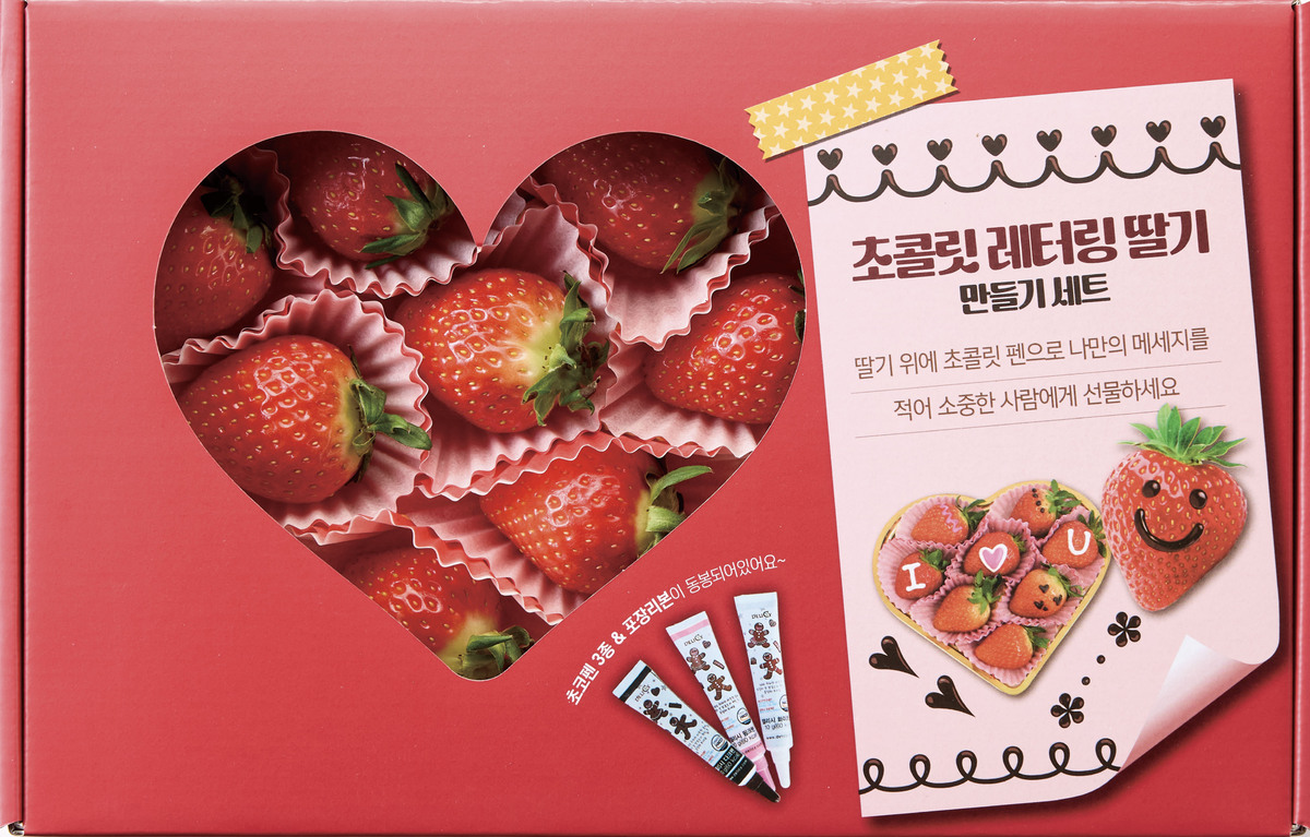 이색 상품도 준비했다. ‘초콜릿 레터링 딸기 만들기 세트’는 설향 딸기 특 사이즈 8개와 초콜릿 펜으로 구성됐다. 딸기에 직접 메시지를 적어 선물할 수 있는 DIY 상품으로 9980원에 판매된다.