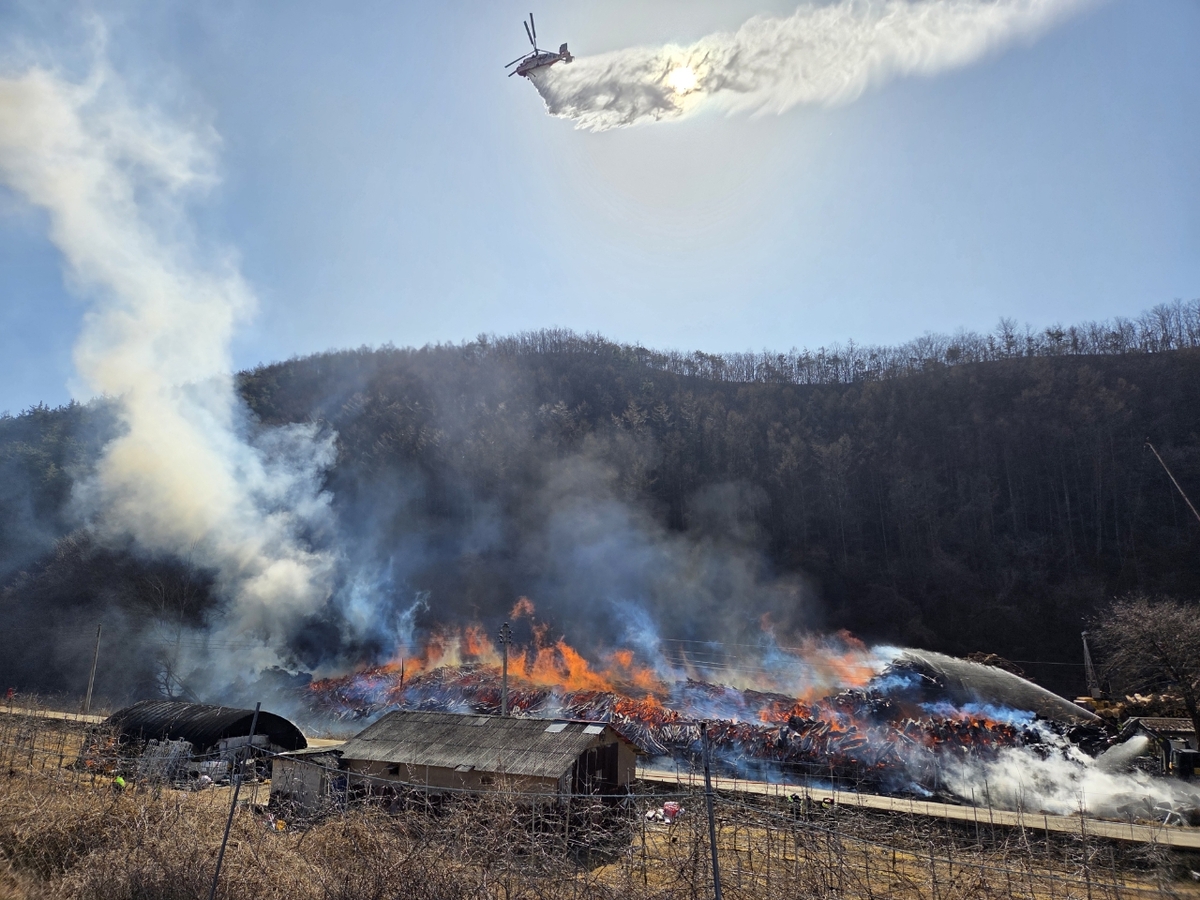 야적해 둔 목재에서 불길 번져...진화 난항 청송소방서 화재진화 헬기 4대 교대로 물 뿌려