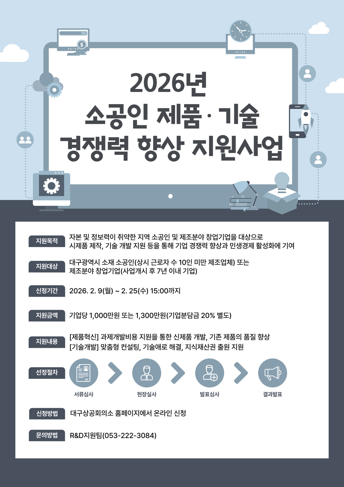 대구상공회의소가 대구시와 함께 지역 소공인과 제조분야 창업기업을 대상으로 ‘2026년 소공인 제품·기술 경쟁력 향상 지원사업’ 참여 신청을 받는다.