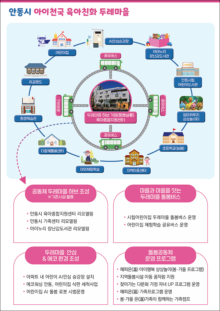 이를 위해 안동시에는 육아종합지원센터를 리모델링해 돌봄 허브를 조성하고, ‘돌봄버스’ 운영으로 등·하원과 체험 이동을 지원한다. 특히, AI 돌봄 로봇 시범 운영으로 미래형 보육환경을 구축한다.