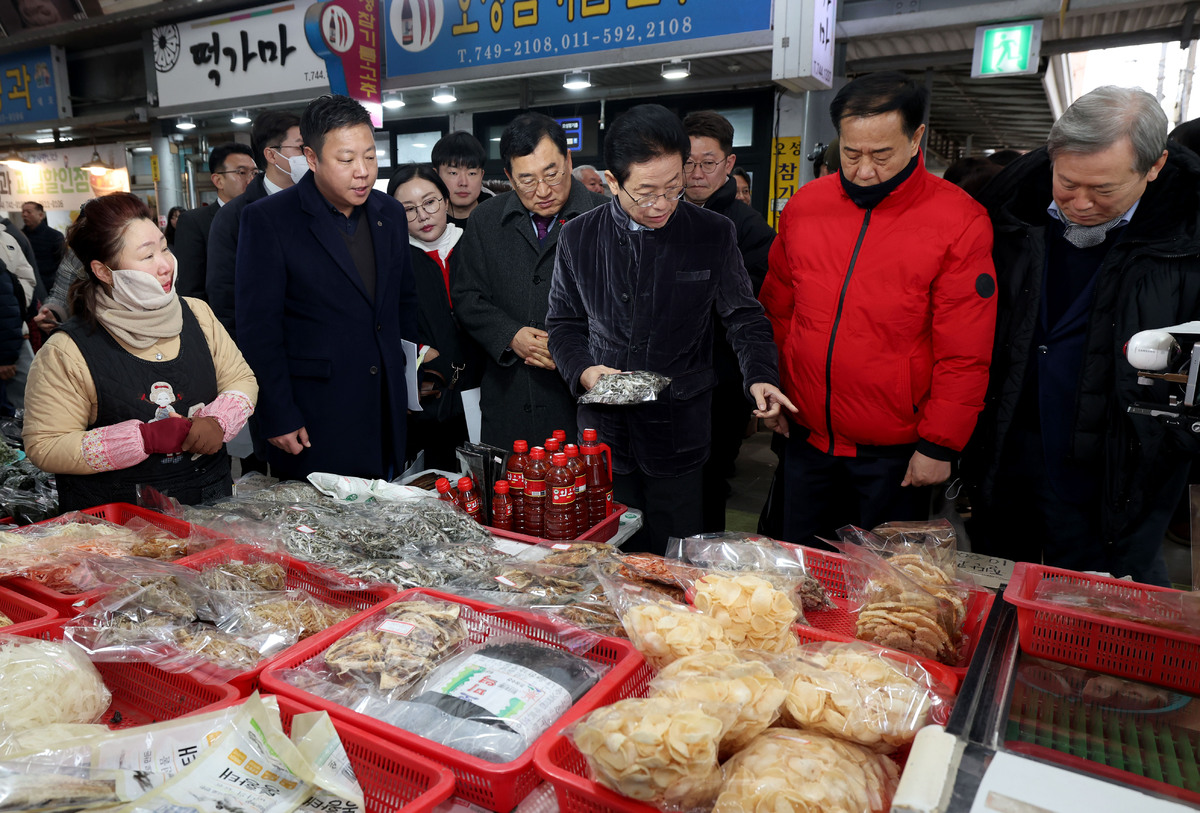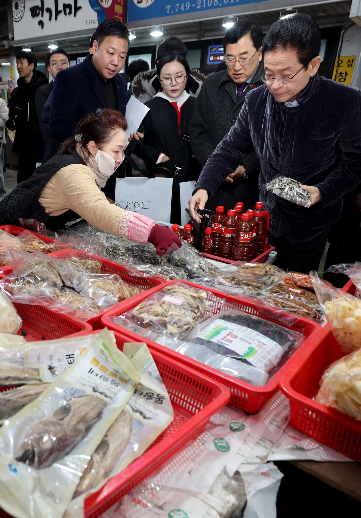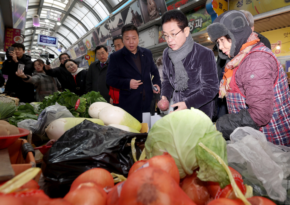 10일 오전 설 명절을 앞두고 전통시장 장보기에 나선 이철우 경북도지사와 주낙영 경주시장 일행이 성동시장에서 지역 농산물을 사고 있다. /이용선기자 photokid@kbmaeil.com