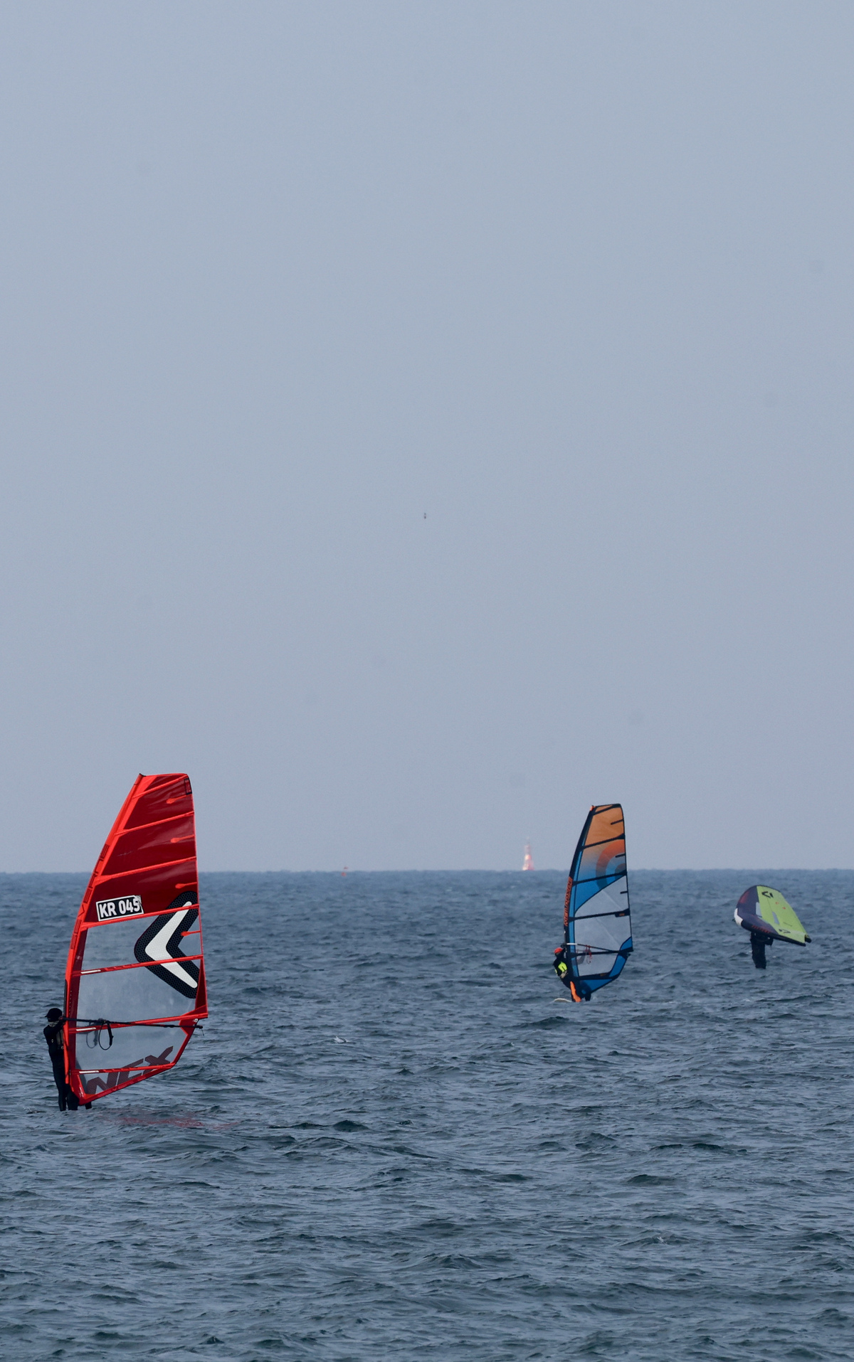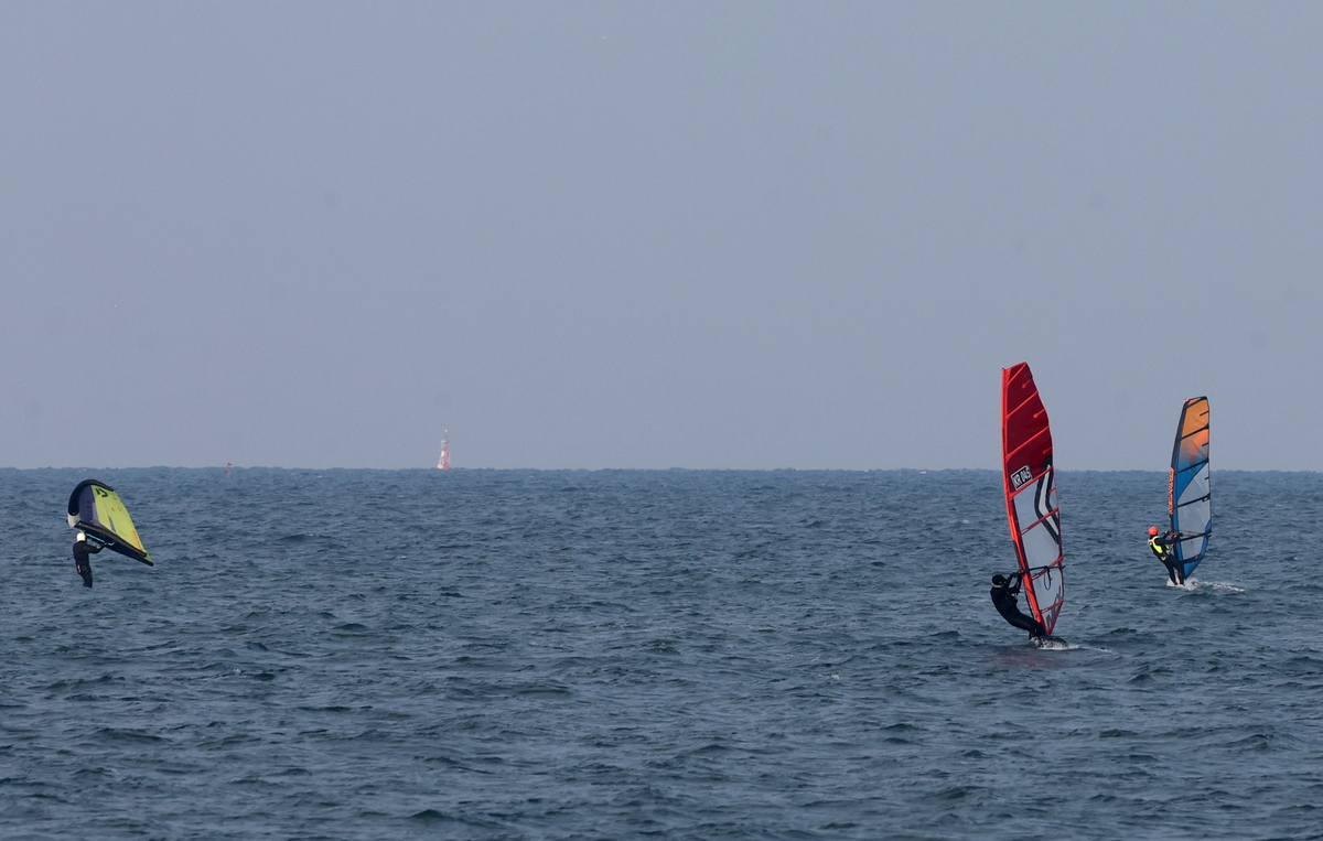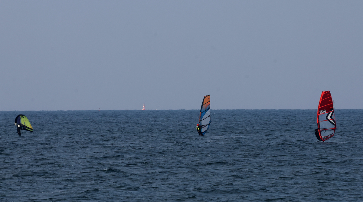 포항 지역 낮 최고 기온이 10℃를 기록하며 포근한 날씨를 보인 11일 오후 남구 동해면 도구해수욕장에서 윈드서핑 동호인들이 파도를 가르며 질주하고 있다. /이용선기자 photokid@kbmaeil.com