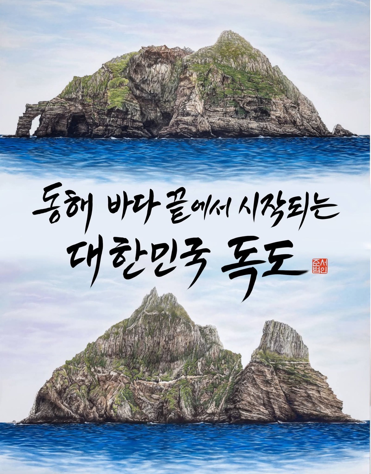 특히 이번 작품은 서준범 작가 특유의 세밀한 묘사가 돋보인다. 독도의 깎아지른 듯한 기암괴석과 척박한 환경 속에서도 푸름을 잃지 않는 식생, 그리고 이를 감싸 안은 동해의 푸른 물결이 한 폭의 수묵화처럼 어우러져 독도의 영롱한 자태를 그대로 재현해냈다. 작품 중앙에 배치된 문구는 독도가 단순히 우리 영토의 끝이 아니라, 대한민국의 시작점이라는 역설적이고도 강한 주권 의지를 담고 있다. 붉은색 낙관은 작가의 예술적 자부심과 함께 우리 땅에 대한 확고한 증명을 상징한다.