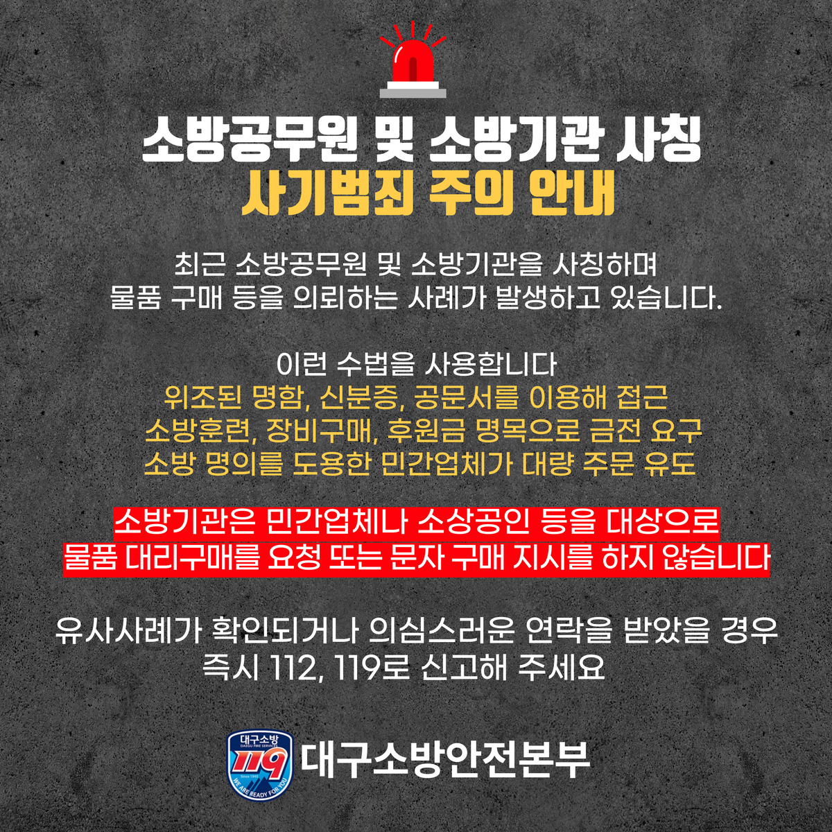 대구소방이 소방공무원과 소방기관을 사칭해 물품 구매나 계약 체결을 유도하는 사기 범죄가 잇따르고 있다며 시민과 업체에 각별한 주의를 당부했다.