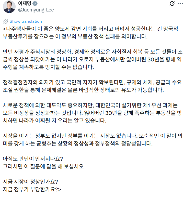 이 대통령은 13일 오전 9시 엑스(X·옛 트위터)에 ‘다주택자들이 이 좋은 양도세 감면 기회를 버리고 버텨서 성공한다는 건 망국적 부동산투기를 잡으려는 이 정부의 부동산 정책 실패를 의미한다’는 제목의 글을 올렸다.