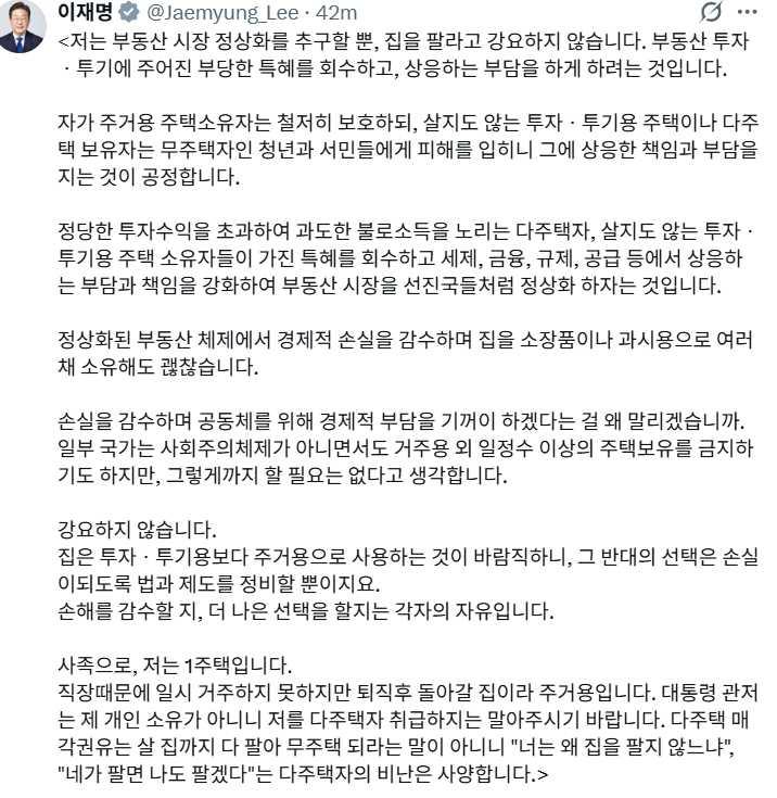 이 대통령은 14일 오전 10시 엑스(X·옛 트위터)에 “저는 부동산 시장 정상화를 추구할 뿐, 집을 팔라고 강요하지 않는다”면서 "부동산 투자·투기에 주어진 부당한 특혜를 회수하고 상응하는 부담을 하게 하려는 것’이라고 주장했다.