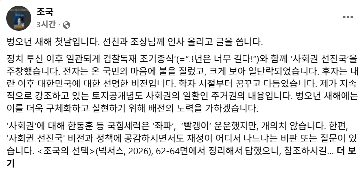 조국 조국혁신당 대표는 설날 아침인 17일 오전 페이스북에 “정치 투신 이후 일관되게 ‘3년은 너무 길다’는 구호로 검찰독재 조기종식과 함께 ‘사회권 선진국‘을 주창했다“며 “전자는 크게 보아 일단락됐고, 후자는 내란 이후 대한민국의 선명한 비전”이라고 말했다.