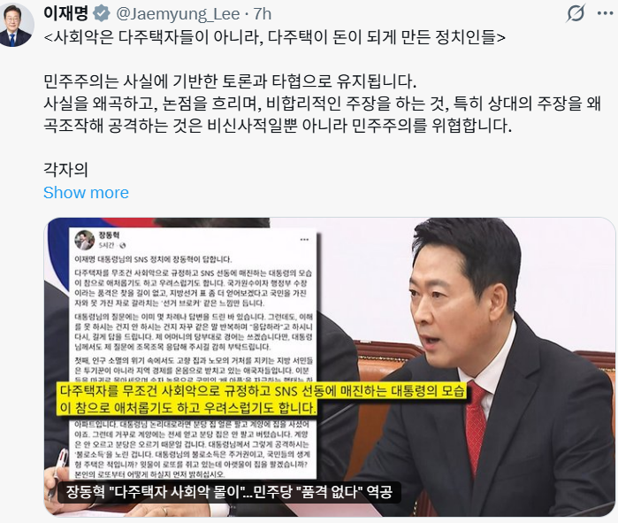 다주택자 문제를 두고 연일 SNS를 통해 공방이 벌어지고 있는 상황에서 자신의 주장을 상대가 왜곡하고 있다는 점을 분명하게 지적한 대목이다.