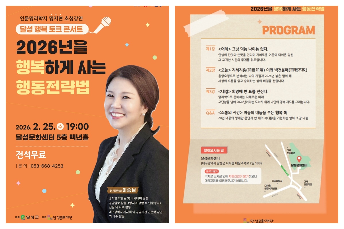 새해를 맞아 군민들이 삶의 방향과 실천 전략을 모색하는 소통의 장이 마련된다. 대구 달성문화재단은 오는 25일 오후 7시 달성문화센터 백년홀에서 ‘2026 달성 행복 토크 콘서트’를 연다고 밝혔다. 강연은 전 좌석 무료로 진행된다.