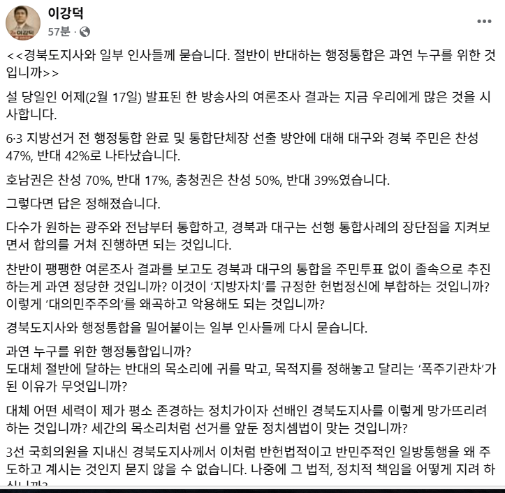 그는 “찬반이 팽팽한 여론조사 결과를 보고도 주민투표 없이 졸속으로 추진하는 게 과연 정당하냐, 지방자치를 규정한 헌법정신에 부합하냐, 이렇게 대의민주주의를 왜곡하고 악용해도 되는 것이냐"고 (이철우 지사 중심의) 통합추진론자들을 비판했다.