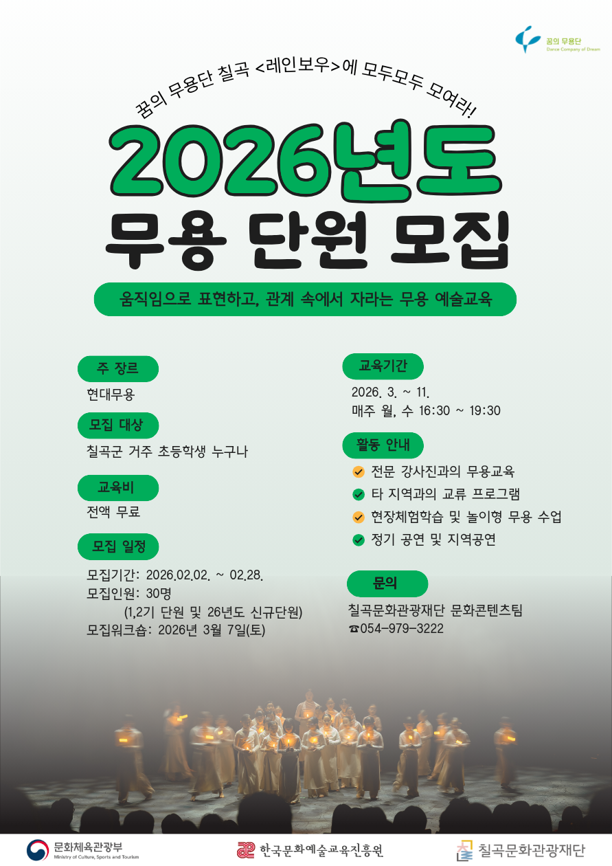 칠곡문화관광재단(이사장 김재욱)은 2026 꿈의 무용단 '칠곡 레인보우’ 신규 단원을 모집한다고 밝혔다.
