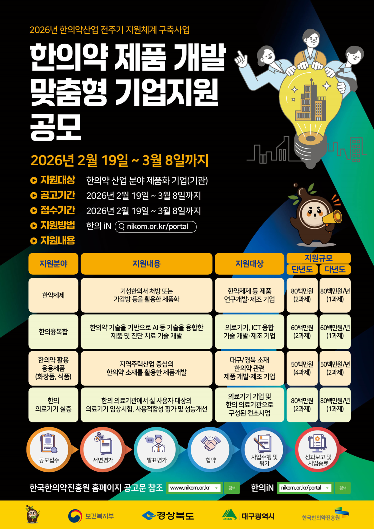 이번 공모는 한의약 제품의 개발부터 제품화, 임상, 기술 고도화에 이르는 산업화 전 과정을 체계적으로 지원해 한의약 산업의 경쟁력을 강화한다.