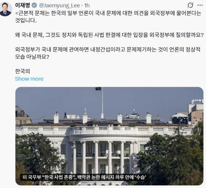 이 대통령은 이날 엑스(X·구 트위터)에 “근본적 문제는 한국의 일부 언론이 국내 문제에 대한 의견을 외국 정부에 물어본다는 것”이라며 일부 언론들의 미국 중심 사고에 불편한 심기를 감추지 않았다.