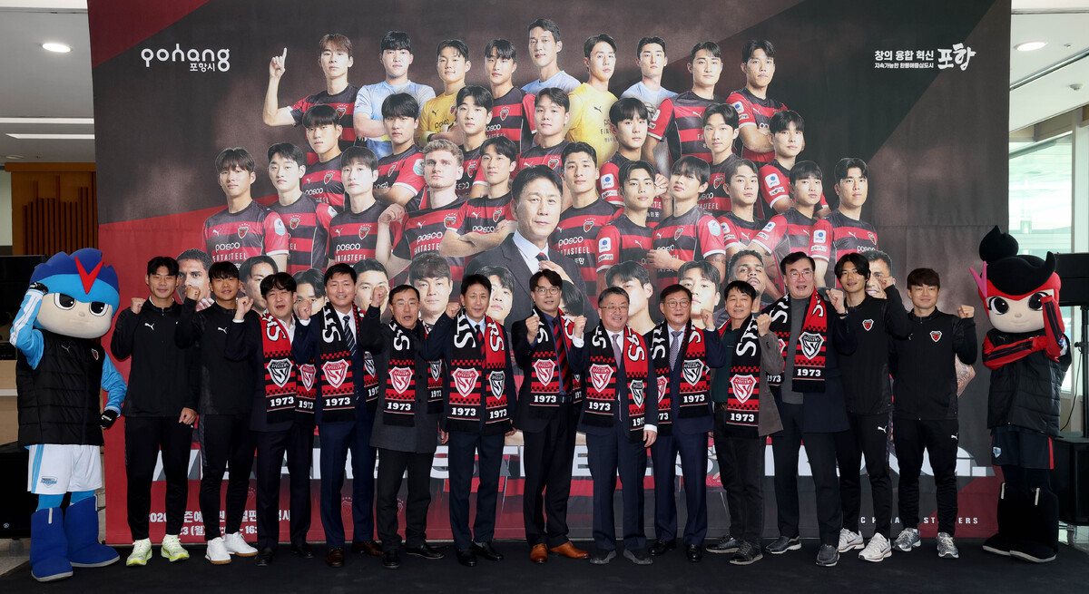 포항 스틸러스 ‘2026시즌 일반석 시즌 예매권’ 판매행사가 23일 오전 포항시청에서 열렸다. 장상길 포항시 부시장, 박태하 감독, 기성용 선수를 비롯한 행사 참가자들이 기념 촬영을 하고 있다. /이용선기자 photokid@kbmaeil.com