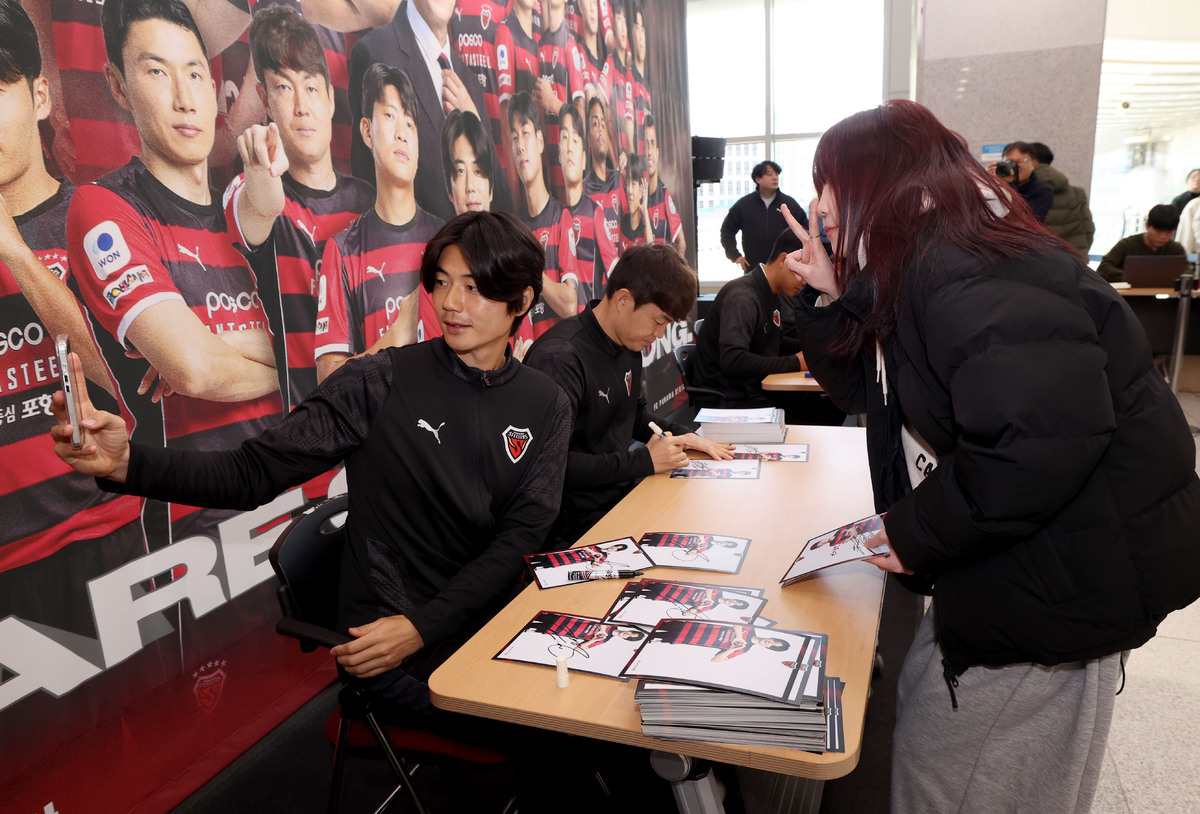 포항 스틸러스 ‘2026시즌 일반석 시즌 예매권’ 판매행사가 23일 오전 포항시청에서 열렸다. 기성용 선수가 팬 사인회에서 기념 촬영을 하고 있다. /이용선기자 photokid@kbmaeil.com